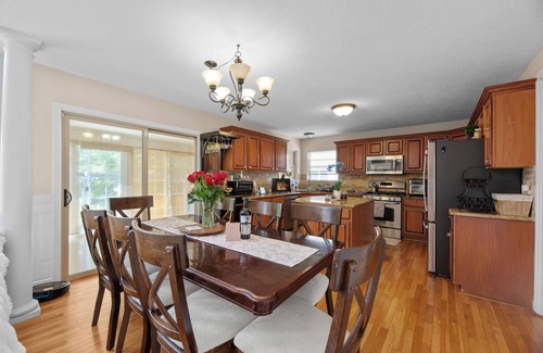 Enjoy the elegance of a by-gone era while staying in this home. Beautifully decorated and featuring a sweeping staircase, original stained-glass windows, beautiful furniture, and a stunningly. Although shops and restaurants are only a five-minute drive away, the area peaceful and secluded. Located in Dublin, this fabulous 6-bedroom house offers a charming and serene retreat for guests. With 4 queen beds, 3 twin bed, and 1 bunk bed that has 3 beds, there's plenty of space for everyone to unwind. Enjoy the convenience of 4 bathrooms equipped with showers and hair dryers. Whether you want to relax in the dining room or explore the city, this property has something for everyone. We hope you enjoy what our place and Dublin has to offer.bed and breakfast is always welcome