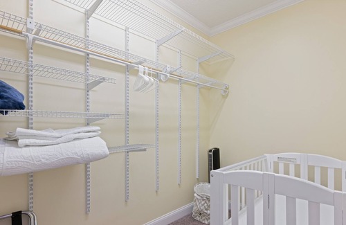 Bedroom 3: Top floor- King bed with ensuite bathroom (shower/tub combo), AND adjoining room with 2 queen beds, kids living area and separate balcony with views. Large walk in closet with portable baby crib.
