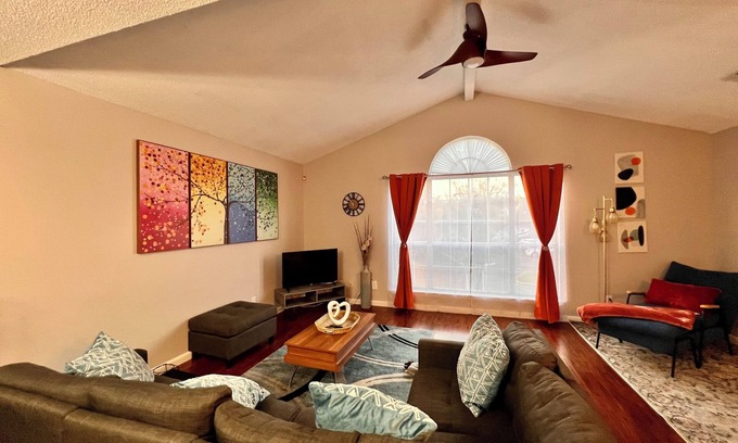 Style - Comfort - Ease. We thought of everything for our long term corporate guest(s) seeking a home-away-from-home during their stay. Unwind on the comfy sofa, relax in your very own reading space and get a restful sleep in the queen size beds. The open living room has high ceilings, tons of natural light, a large L-shaped comfortable sofa, a smart TV with lots of preloaded channels, a dedicated workspace, a reading space with a plush recliner, a dining room table that seats six, a fully stocked kitchen with all the cookware, flatware and appliances you’ll need and a full-size washer and dryer dryer. There’s also a private patio, access to the community pool and plenty of free parking. Located within minutes to the Redstone Arsenal and Research Park, Toyota Field, Madison Hospital, Bridge Street Town Centre shopping and the Huntsville international airport.