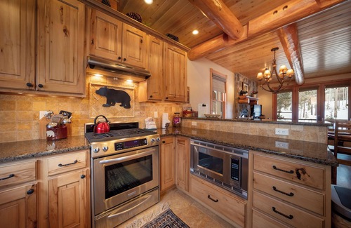 The main level has an open floor plan encompassing the living, kitchen and dining areas making for a perfect area to gather for entertainment and meals with exposed wood beams and wood ceiling throughout. In the gourmet kitchen plenty of countertop space and great spot to make a memorable meal. Cozy up to the wood fireplace to enjoy the warmth and true mountain getaway. The large private deck is accessible from the main living area and provides a wonderful spot to enjoy the view and spot to share light snacks, morning coffee or evening drinks. A powder room is also on the main landing.