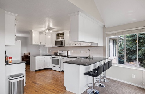 The kitchen, living room, and dining room are all connected and are the heart of the home for gathering, eating, and creating memories. The kitchen is fully stocked and has an island with seating for 3 people. In the dining room, you will find the dining table that seats 10 and provides access to the garage. The living space has a 85" TV surrounded by a stylish couch and two (2) armchairs.