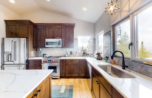Inside your recently remodeled abode, you'll find heartwarming interior decor, and comfortable couches lining the walls of your spacious living area. This home away from home also boasts a splendid full kitchen, equipped with stainless steel appliances, including a Wolf oven, so you can cook a delicious meal for yourself and your guests for dinner.