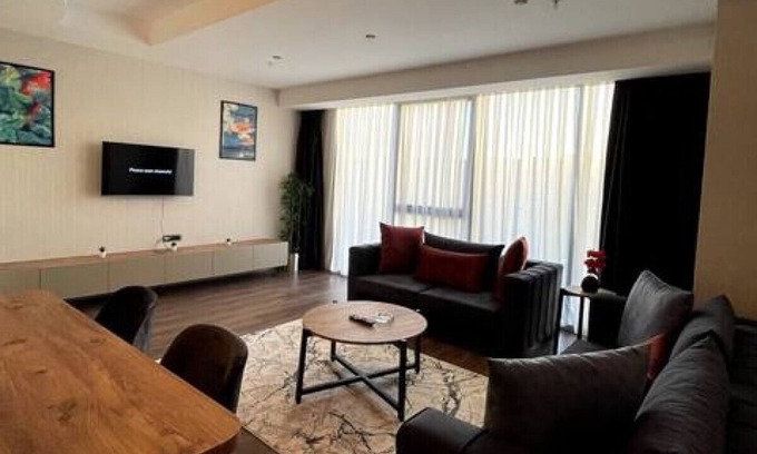 The apartment features 5-star amenities including: AC, WIFI, a dishwasher, an electric kettle, a microwave, a water dispenser, a Smart TV, and ceiling-high windows.