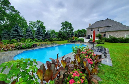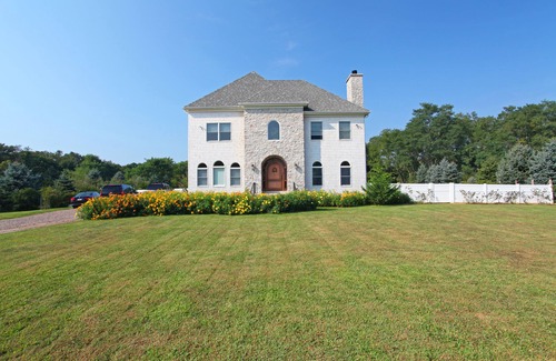 New 4 bedroom 3 1/2 bathrooms with built in pool on a 2 acre private setting. A perfect place to unwind away from it all. Close to a beautiful bay beach. Plenty of vineyards close by for wine tastings. Home has four bedrooms, two have private bathrooms and two share a bathroom. The pool area has 8 lounge chairs with cushions, making it a perfect place to relax. The deck off the kitchen has a table and umbrella, perfect for outside dining. The house is perfect for 4 couples or two families with children. Owner has apartment that will be used during your stay.