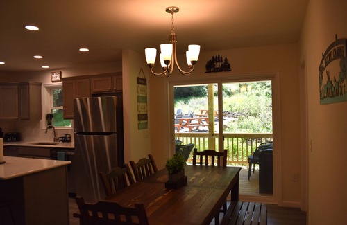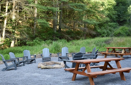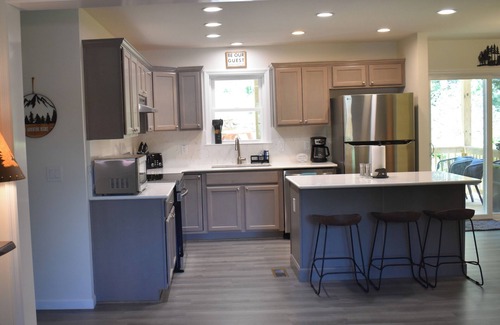Relax and unwind at this exceptional and roomy 5-bedroom house. Each room offers a pleasant and soothing atmosphere. On the first floor is 1 king bedroom with a private bathroom and 2 queen bedrooms with a shared bathroom. The second floor has 1 queen bedroom with a work desk at the dormer window and another queen bedroom that also has a separate twin bed and a work station with a view. These bedrooms share a large bathroom. The second floor bonus room is a large area with 5 twin beds and 2 arcade style games, great for the family and friends! The 3 bathrooms are equipped with a shower or bathtub for your convenience. All bedrooms are equipped with Roku TVs, ceiling fans and sizeable closets. There are large TVs in the Living and Bonus rooms as well. Relax in the superb living room or enjoy the wonderful kitchen with all the necessities including an island and quartz countertops. Out back you'll find an ample covered porch with a dining table and chairs, next to it is a separate area with a gas grill and picnic table on a concrete pad. Beyond that is a large fire pit complete with picnic tables and Adirondack style chairs for relaxing by the campfire and enjoying the natural surroundings. Experience what "The Homestead" has to offer with a stay at our place in this quaint small town.