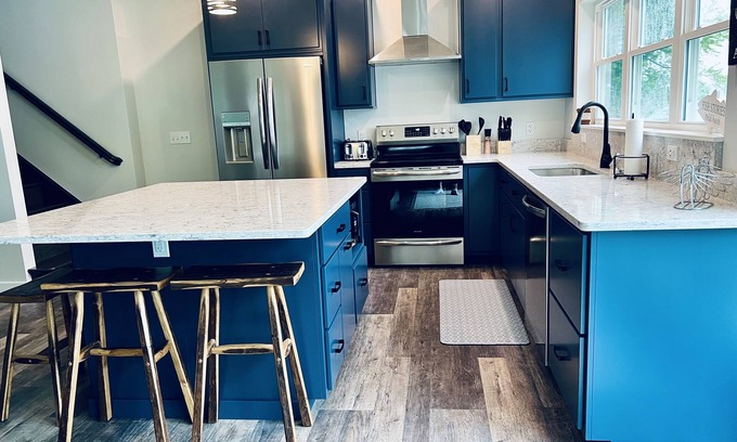 Large island and brand new stainless steel appliances including a wine fridge will make meal time fun!