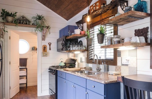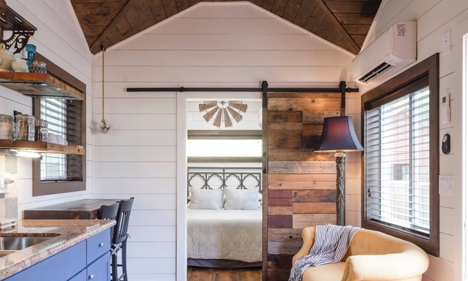 Built in 2018, this space lives large with soaring 10 ft tall cedar ceilings and shiplap walls. Features a menagerie of hand crafted touches - barn door, shelves and tables from reclaimed and salvaged wood. The tiny house features one bedroom, kitchen and bathroom all on the same level. It's a permanent structure on a foundation and completely permitted, not on wheels. There are dozens of bars and restaurants within easy walking distance, but if you want to cook, the house features a full size kitchen with 4 burner gas stove, standard refrigerator/freezer, microwave, granite counters. Locally made tea and coffee roasted around the corner provided. The full size bathroom features a petrified wood sink! Full size tub with a rainfall LED temperature control shower head, standard fully plumbed toilet and soft fluffy towels. No cramped quarters here, the shower height area is over 7 ft tall. At the end of the day, a queen size Casper mattress awaits, oufitted with organic cotton sheets and topped with an allergy friendly Buffy comforter, made from natural eucalyptus for temperature moderation. Hypo-allergenic pillows and mattress all completely encased. A Roku TV enables you to log in to your entertainment provider of choice, netfli, hbo max and disney plus is provided.
