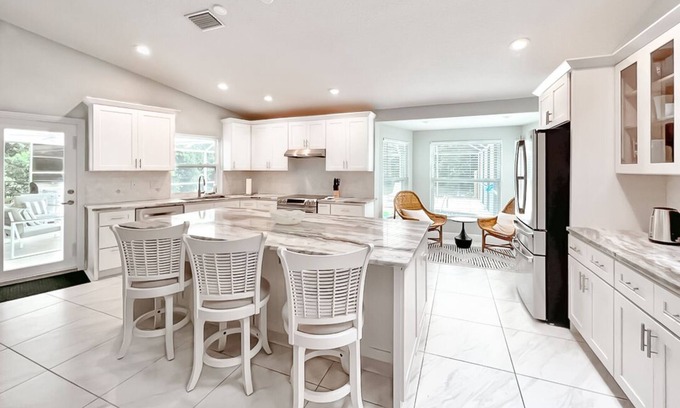 Step into our inviting kitchen, a culinary haven designed to inspire your inner chef. Featuring bright high ceilings, the kitchen exudes an airy and open ambiance. The large island takes center stage, offering ample counter space for meal preparation and serving. Gather around the island and engage in lively conversations while enjoying a glass of wine or savory appetizers. Or start your mornings off right with a freshly brewed cup of coffee in the inviting nook.