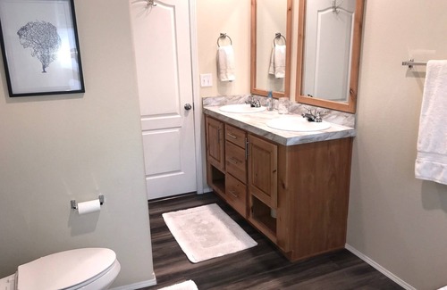 Relax and entertain in 1,800 sq. ft. with kitchen bar, 3 bedrooms, 2 full baths and 2 living spaces. The main living space has a 70" Smart TV and is an open concept to the dining room and well-equipped kitchen. The first room has a king bed with walk in closet, bathroom with dual sinks, soaking tub and standup shower. The second room has a queen bed. The third room has a queen on queen bunk bed.