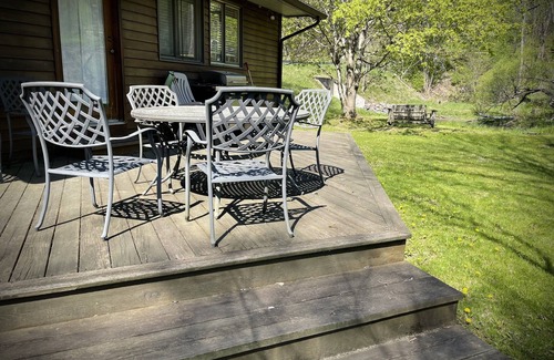 This spacious 2BR, 1Bath Apartment has its own private entrance and includes a large bright living room/kitchen/dining room area with vaulted ceilings and a wall of windows that overlook beautiful Fly Creek. The unit is fully stocked with linens, pots, pans, dishes, 3 TV's, iron, ironing board, hair dryer, Wireless HI SPEED Internet and BBQ grill for cooking on your private deck. You will feel at peace when you relax out back by the creek after a day of baseball. We are in the perfect location! Walkable to Fly Creek Cider Mill and the Pail Shop Vineyard. If booking for the 2026 Dreams Park Tournaments, reservations follow the 6-night check-in/check-out baseball schedule: