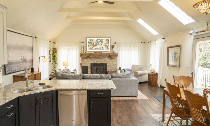 The additional guest house has a king bedroom + office with a twin sized sleeper chair. The space includes a small kitchenette, living room, and full bathroom with shower.