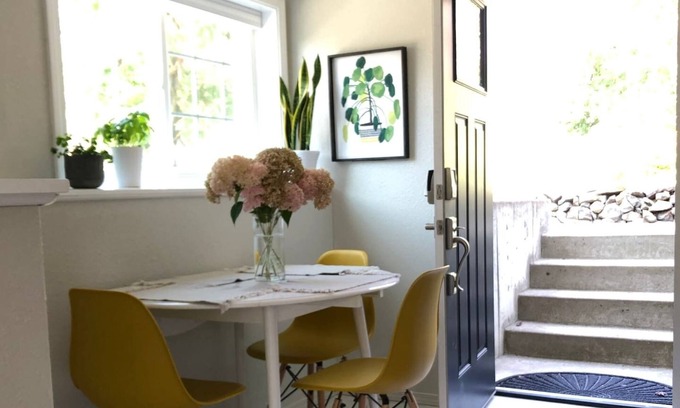 Just 20 minutes from downtown, our sunny daylight basement has recently been remodeled for you! Enter through your own door with a key-pad lock. A hot tub and gazebo are right outside the door, with patio furniture, a gas fire pit, and a BBQ grill ready to be enjoyed. The interior space is bright and sparkling clean! The kitchen opens into the family room with a smart TV. Just around the corner are two bed rooms and a newly remodeled bathroom. Now offering outdoor pool rental and electric bikes!
