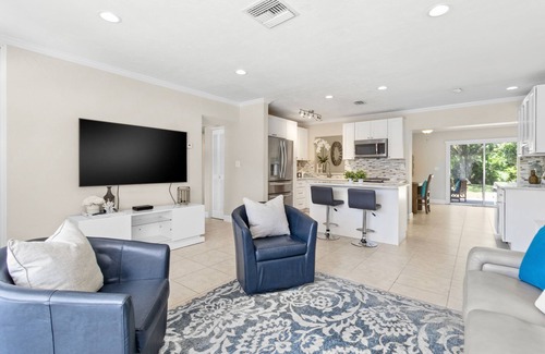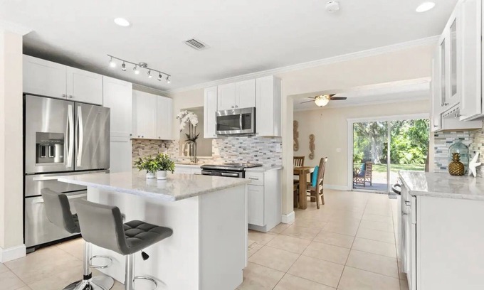 Kick up your feet and relax at The Palms - inside and outside! This modern coastal decorated home is spacious and open with plenty of room for the whole family. With multiple beautiful Gulf Beaches less than 15 minutes away and a private, fenced-in backyard, encompassed with mature palms, this property is perfect for a family get- away or staycation!
