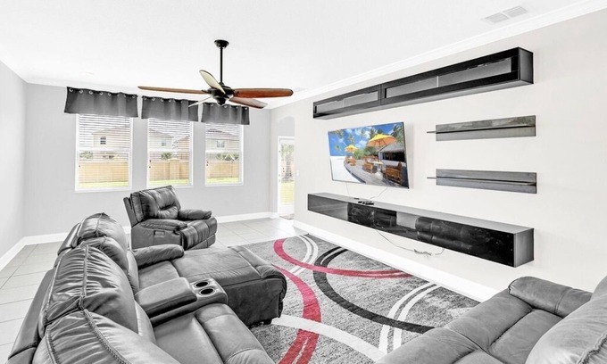 Recently upgraded and beautifully furnished throughout, this spacious and private five-bedroom home features an open floor plan with an upscale kitchen, counter-height seating, dining area, dedicated workspaces, and a living room with 70” Smart TV.