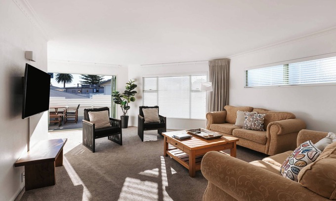 Large 4-bedroom home in the heart of Mount Maunganui, steps from the beach, shops, and cafes. Sleeps 9 with 2 bathrooms and 2 extra toilets. Walk to surf, Mauao, hot pools, Pilot Bay, playgrounds, markets, and restaurants. Features an open-plan living area, full kitchen, and garage lounge for kids to hang out. Ideal for family getaways or group stays in the best location the Mount has to offer.