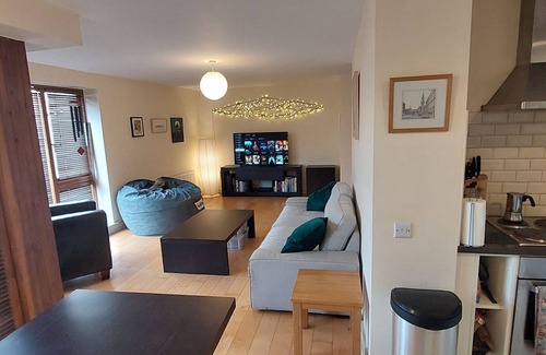Spacious 1-bedroom riverside apartment in vibrant D8 village. Features a large sitting room with TV and comfy Buddha bag, perfect for relaxing after a day exploring Dublin.