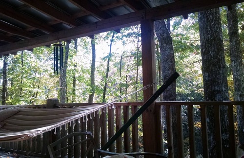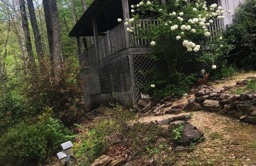 Featuring a king master on the main floor and two upstairs bedrooms, one with a queen bed and another with 2 single beds. Perfect for a family getaway to the Mountains. Easily accessible but tucked away on a wooded lot, this home is surrounded by nature and is only a 20 minute walk to a secret waterfall and natural swimming pool! Enjoy your breakfast on the back porch birdwatching or spend an evening out on the front porch fully equipped with an outside fireplace, seating and a swinging hammock. Listen to the trickling stream, read a book or simply enjoy the sights and sounds of nature. With a spacious & fully stocked kitchen, fireplaced living room, comfy bedrooms, newly renovated bathrooms, front and back covered decks, outdoor fire pit, games, tv and Wi-Fi, you'll have everything you need! When you do venture out, Downtown Clayton (only 10 minutes away) offers shopping, restaurants, local specialty stores and more!