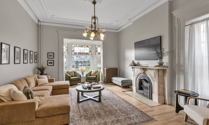 Sprawling across the entire first floor of this historic mansion, this spacious suite encompasses all of the formal entertaining spaces from when the house was occupied by only a single family. Now converted to two bedrooms and two full bathrooms while maintaining original features including marble fireplaces, stained glass windows, hardwood floors, intricate moldings and brass fixtures. This architectural character is accentuated with appointments that seamlessly blend classic charm with modern amenities. Escape to another century of luxury and experience architecture as art.