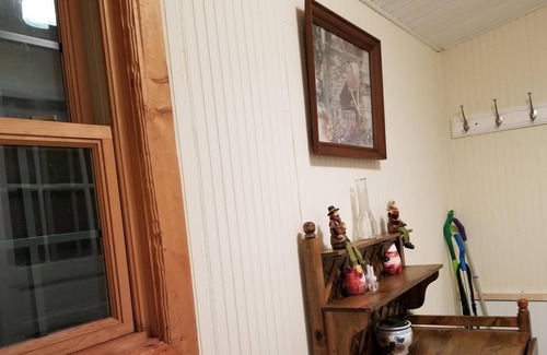 Central heat and air, or gas fireplace at your comfort. Ceiling fans. Entrance from front deck and back porch. Back porch has covered walk way from parking area, set your "stuff" out of your way, or just sit and relax.