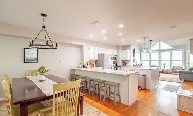 The Main Level features an open floor plan kitchen, dining, living space, and a half bath. The dining has seating for 8+ with additional bar seating for 5. The kitchen is well-equipped with updated finishes and all of the cookware/appliances you could need for a home-cooked meal. All of the basic necessities are provided- coffee, creamer, sugar, olive oil, salt & pepper. The living room boasts vaulted ceilings, wall-to-wall mountain views, a wood-burning fireplace (wood provided), and access to the scenic deck. The Roku TV has all of the standard apps- just bring your own login. There is a custom made detailed GuideBook that provides information about both the house and activities, food, wine, beer, hiking, etc in the local area.