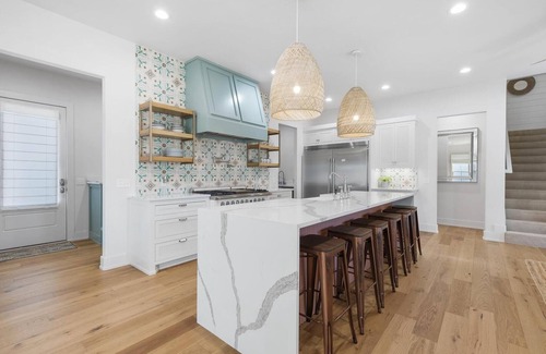Two King primary suites are on the first floor, each with upscale furnishings, televisions and full ensuite bathrooms. Showers are sizable walk-ins with rainfall shower heads and hand held attachments. Upstairs there are two more King suites with ensuite bathrooms. One has a tiled shower, while the other has a shower/tub combo. Closets include everything you need for settling-in, including box fans and extra pillows. Travel size toiletries are provided for your stay.