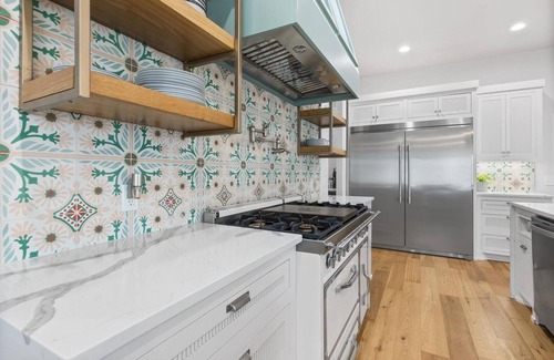 The gourmet kitchen is a dream for home chefs and entertainers alike, featuring waterfall quartz countertops, double dishwashers, and a Viking range. Generous cookware and serveware make meal preparation convenient. There’s a large pantry with plenty of storage space, a coffee bar and a free standing ice-maker. Whether you're prepping a quick breakfast or a big holiday meal, this space can handle it all.