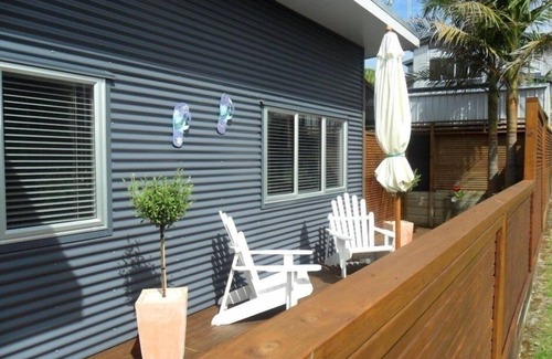 The Bach is modern and centrally located in Whiritoa with a great indoor outdoor flow through french doors opening out to sunny wrap around decks. Deck has a permanent awning that offers both sun protection and shelter from the rain. Open plan kitchen and dining area with tiled floor and carpeted lounge. Completely furnished with all mod cons, BBQ, Coffee Machine, surround sound entertainment system, cutlery and crockery etc. Three double bedrooms, (the master with ensuite) plus an additional separate bathroom with shower and toilet. Warm in winter with gas heating and a DVS system for your comfort. Highchair, and Toys, games and Lego to keep the children entertained. Easily accommodates up to 8 people (more by neg) but also perfect just for a couple. Discount neg for longer stays ( 10 nights in summer4 in winter. please ask.)