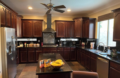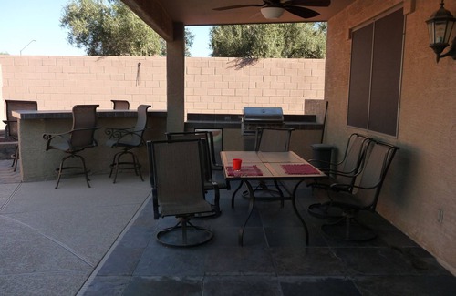 My 4 bedroom home is situated in a quiet area of Surprise Arizona, a Phoenix suburb, facing a beautiful park and playground. The south west facing back yard includes a covered patio, BBQ area, fire pit, and a spacious heated pool.