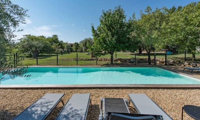 Situated in a hundred year old olive grove, with spectacular views of the Provençal countryside. Our home is a modern construction continually improved yearly, has 7 bedrooms and 5 bathrooms 3 of which are ensuite sleeping 18 people total. Luxurious swimming pool, large open kitchen, 2 living/TV spaces, BBQ, pétanque. Tennis courts across the road, PGA golf course and luxury spa nearby at Domaine de Terre Blanche. Solar Panels and energy efficient appliances.