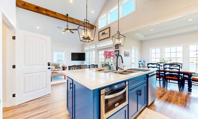 Composed of high ceilings, hardwood flooring, and nautical mementos, the interior of The River Overlook has been meticulously curated for a comfortable stay. The full kitchen is highlighted by a brilliant blue-tile backsplash and presents stainless steel appliances and a sizable breakfast bar/center island. The adjacent living room is perfect for movie viewing with its large smart TV and oversized sofa.