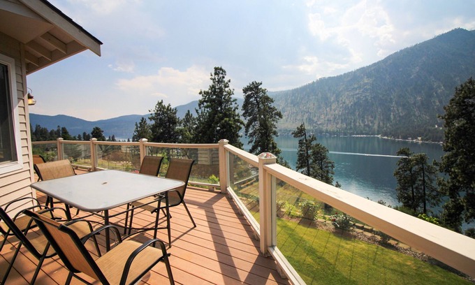 Relax and take in the scenery at this Manson home with stunning views of Lake Chelan! Outside on the sprawling, wrap-around deck, you can sip your morning coffee, dine al fresco with a view of the lake and mountains, and spend your evenings gazing at the beautiful night sky. Use the gas grill on the patio for your summertime barbecues, or prepare full meals in the gourmet kitchen. There's plenty of space inside for your entire group to spread out, with a formal living room upstairs and a family room downstairs that are both ideal for board games and movie nights.