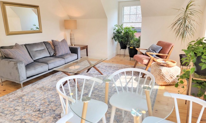 We are pleased to offer our two-bedroom, sun-filled suite located on the third floor of our home. The elegantly designed space features two bedrooms that share a beautifully appointed bathroom and a spacious living room. While the staircase leading up to the suite is narrow and steep, we assure you that the climb is well worth it (but you may want to pack light :)). Nestled in the heart of the residential West End, we are still walkable to many restaurants and shops in Portland. *Street Parking*