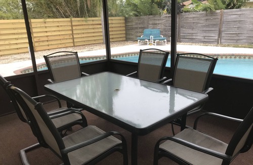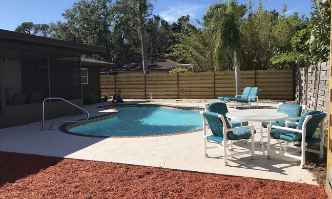 * Fenced Pool, no cage makes it warm year round, outside table and chairs seat 4, comfy lounges.