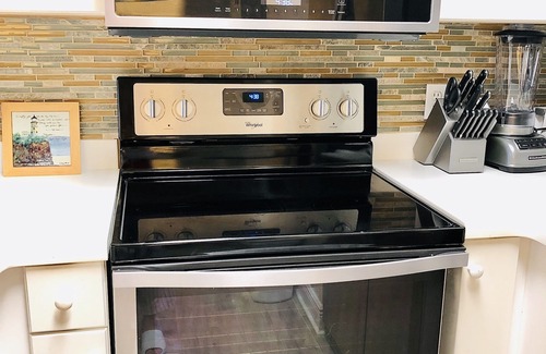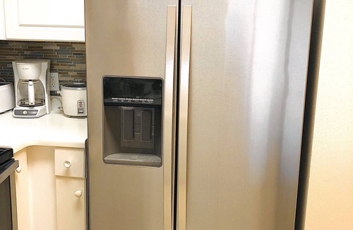 Stainless-Steel Whirlpool Appliances: side by side refrigerator, smooth-top stove & oven, microwave and dishwasher;