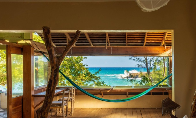 Enjoy waking up to a cup of Jamaican Blue Mountain Coffee sitting in your hammock chairs overlooking the white sand beach! There is a large deck with a double size lounger as well!