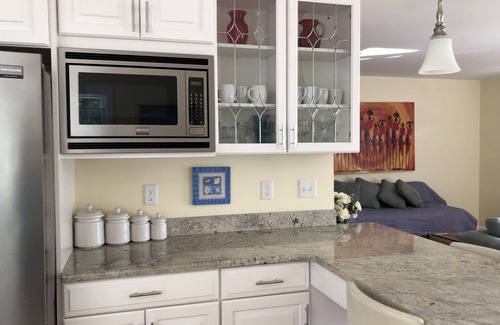 This comfortable and charming home is located within a 5 minute walk to downtown Edgartown with great shopping, movie theater, quiet harbor and fabulous restaurants. A 5 minute drive will get you to the quiet State Beach or a 10 minute drive will bring you to the roar of the ocean at South Beach. It is located near all the major Island roads, making it an easy ride to any of the other Island towns and attractions. It's right on the bus line if you want to leave your car behind for the day. This home features four crisp bedrooms each with a good sized closet. The kitchen was just remodeled featuring a gas stove, granite countertop and a granite peninsula where a small group can gather to eat. It also has a good sized kitchen table and sliding glass door out to the patio. There is lots of light. The local grocery store is just around the corner. The comfortable living room has a flat screen TV and DVR for watching movies on rainy days. It is an open floor plan. There are beautiful hardwood floors throughout. Outside is a furnished patio area with gas grill, large yard for lawn games and an outdoor shower with hot and cold water. Air conditioning throughout with controls in each room. There is a basketball hoop for practicing outside.