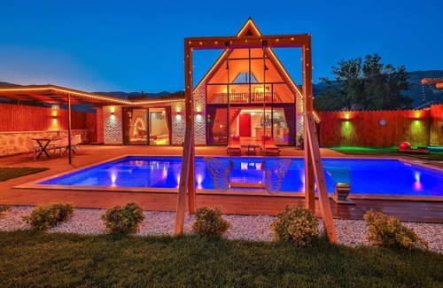 It is a holiday villa for 4 people located in the Sarıbelen region of Kalkan. Our holiday villa in nature has a large pool and a private garden. There are options such as a children's playground, barbecue, and swing in the garden of our villa. Our villa, which has a stylish and comfortable interior decoration, has 2 bedrooms. There is a double bed in both rooms and a jacuzzi in one room. In addition, there is a sauna in our villa.