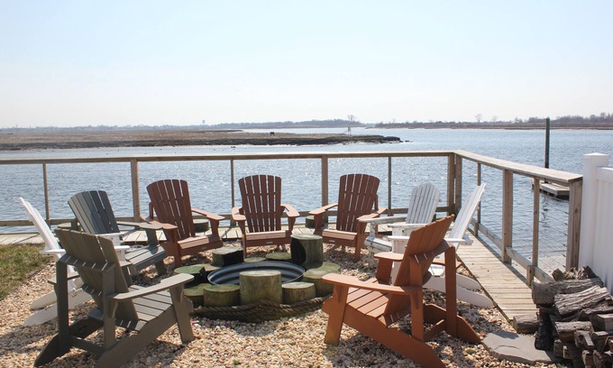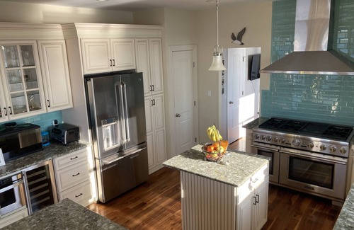 You will feel like you are miles away from the hustle and bustle of everyday life. Whether it's sipping coffee (complimentary) on the private master balcony in the morning or watching the kids jump off the pier during the hot afternoons. Kayak or Paddleboard (2 kid kayaks, 3 adult kayaks 2 kid paddleboards and 2 adult paddleboards provided) over to the secluded beach for a picnic lunch. Catch a tan on the lounge chairs on the main level deck or out on the float bayside. For the younger kids there is a swing set with house and slide, a springless trampoline, basketball hoop, basketball arcade and foosball table. From the main deck and private balcony the views go on for miles to the west and south. After a day of paddle boarding and kayaking enjoy a relaxing spa session in the 6 person hot tub or refresh yourself in the hot water equipped outdoor shower. Grab a drink and snack from the fully stocked complimentary mini bar. Prepare meals in the fully equipped kitchen with 48" Thermador Range or on the outdoor gas grill. There are three outdoor entertaining areas, the main deck with teak lounge chairs, benches and dining table. Covered patio on the ground level with a lounge area, picnic table, two swinging chairs and a basketball arcade. The bayside firepit area with Adirondack Chairs is the perfect way to end the day. Think Smores! After a fun filled day retreat to the top level Master Suite w/ king size bed, walk in closet and private bath w/ custom shower w/ bench. There are two additional bedrooms on the top level and an additional full bath with shower tub combo plus a laundry room. The bedrooms consist of twin over full and an additional twin size bed that can be pulled out in both rooms, sleeping 4 guests per room. On the main level there is an office/additional sleeping area with a queen sized sleeper sofa, flat screen TV and a half bath. The fully equipped kitchen with high-end appliances and bar seating for 4 is located on the main level along with the open concept dining room and living room with flat screen TV.