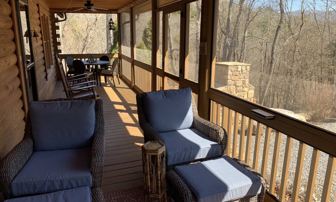 Pristine log cabin on 5 quiet acres, walking distance to cycling, fishing, boating, and tubing on the Jackson River, 10 minute drive to The Homestead resort and its world class golf courses and ski hill, 15 minutes to Lake Moomaw, the best undiscovered lake in the region. Quick 5 minute drive to newly refurbished Jefferson Baths. Spectacular massive outdoor fireplace with private deck to view the shooting stars. Wrap around porch (partially screened) to enjoy the best of Bath County. INDOOR LIVING: WiFI, 2 flat-screen Smart TVs, dining table, gas stoves, hardwood floors, vaulted wood beam ceilings, open floor plan. Outdoor Ring security cams by garage and back deck. Sleeps 8.