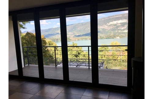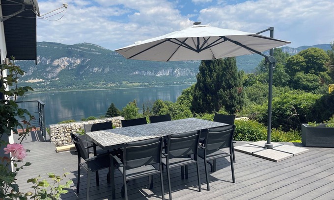 Les Platieres is a modern completely refurbished house, with spectacular panoramic views of Lac-du-Bourget both from within the house and the terraces. Nestled in forest land and it's own large private garden, within the pretty village of Conjux, close to Aix-les-Bains, Annecy, Abbey d’Hautcombe and Chanaz. Perfect for those wanting opportunities for watersports (local beach and port), lake beach, cycling, hiking and skiing only 40 mins drive in the winter.