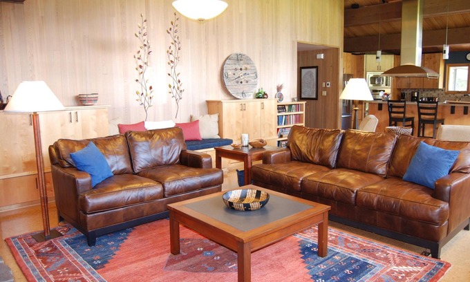 Our luxurious and comfortable mountain home is located on 10 quiet acres at the base of Mt. Hood. With 3,500 square feet and two living areas to spread out and relax, our modern, single story house is ideal for families or group retreats and meetings. Our professionally decorated home features vaulted ceilings, 3 fireplaces (1 each of wood burning, gas burning, and wood stove), and a spacious, fully-equipped gourmet kitchen. The dining table seats 8, but can be easily expanded to seat 12 or more. There is an attached two car garage, which includes a 240 volt plug-in for an electric car and a workbench for ski tuning. The house was extensively remodeled in 2006 with environmentally friendly materials and appliances, earning it the distinguished LEED (Leadership in Energy and Environmental Design) certification award. It was also featured in Oregon Home Magazine.