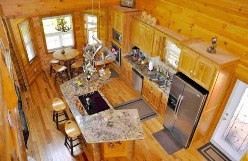 The main living area has leather sofas for ultimate rest and relaxation. It features a gas log fireplace in a stone wall right next to the magnificent open kitchen. The French doors open to the wide wrap-around porch allowing you to admire the unique mountain views. Enjoy the beautiful scenery and evening skies filled with stars and an enchanting blue moon.