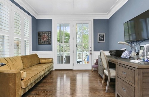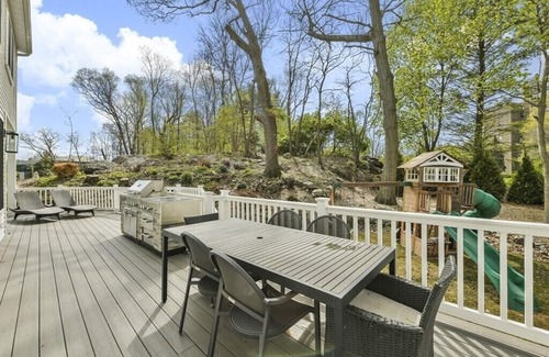 Living room w/fire place, open concept kitchen with family room. High end furniture from Restoration Hardware/Bloomingdales. Kitchen is fully equipped w/high-end, Thermador appliances, refrigerator, dishwasher, wine fridge.Large kitchen island w/quartz counter tops. Kitchen is open to the family room. French doors lead to a large deck with high end gas BBQ. Enjoy cookout while gazing at at beautiful flower garden. Backyard has large playset if you are bringing children. There is dinning room, living room, family room and and office on the 1st floor. 2nd floor has 4 Bedrooms and 3 full bathrooms. Master Bedroom w/king size bed, walk-in closet and spa like bathroom. Lower level has a movie room, exercise room and full bathroom. Next to Chest Hill Mall, World Class shopping and restaurants, supermarket. Near T station, minutes to Longwood Medical Area, Fenway Park & Down Town Boston.