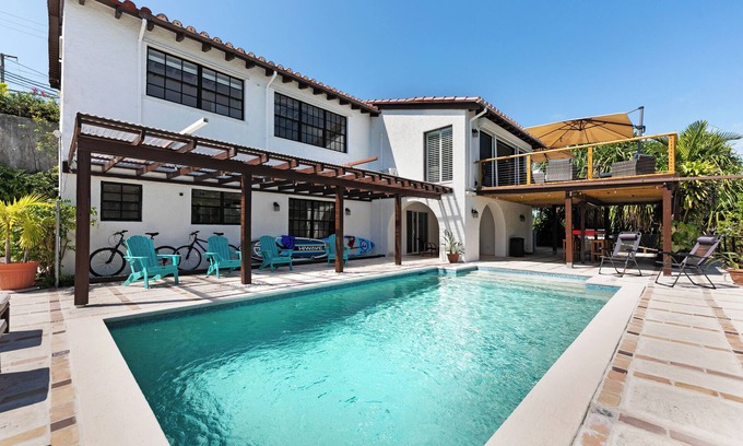 Perched atop a hill with sweeping views of the sea and surrounding islands, this Spanish-style villa blends timeless charm with coastal elegance. Multiple terraces, large dining tables, and cozy seating areas make it perfect for relaxing or gathering with family and friends. The lush tropical garden surrounds an inviting pool, creating a private oasis. Enjoy beach days with all the gear you need—chairs, umbrellas, snorkels, coolers, and more. Back at the villa, keep the fun going with a wide range of sports and entertainment options. Several stunning beaches with turquoise, shallow waters are just a short walk away, making this the ultimate island escape.