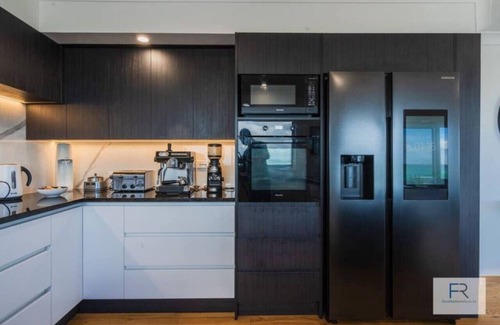 The kitchen is well-appointed featuring a coffee machine, microwave, dishwasher, full oven, kettle, cold water filter tap, toaster, and blender.