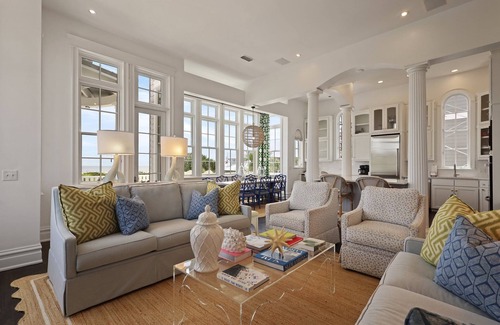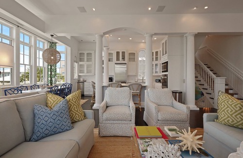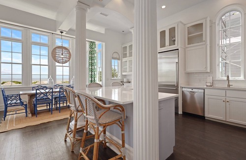 The kitchen in Emmeline Cottage is a great place to serve breakfast, lunch, or dinner on a whim. Here, guests can access a collection of stainless-steel appliances, sleek cabinetry, and an extended breakfast bar and island situated between columns that incorporate a touch of undeniable luxury. When it's time to dine, a spacious dining room table is settled within a dining nook filled with windows and natural light. Of course, when the weather is right, there's nothing like taking a meal outside to one of the many extended balconies and decks available for enjoying. With the two ovens and two dishwashers, a nice evening dinner overlooking the beach is easy and clean-up is fast!