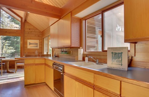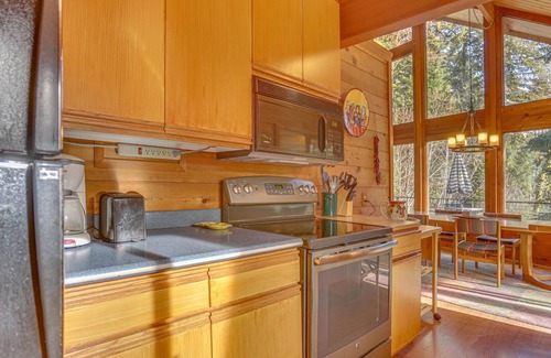The views of Mt Hood are yours to enjoy at the Clear Creek Cabin, a spacious 3-level home on acreage. Enjoy the view of Mt Hood and the Mt Hood National Forest from the great room, decks and yard while you and your guests take in the calmness of the bubbling sounds of Clear Creek. Cook a fabulous feast in the kitchen with Mt Hood views. Walk out to the view deck to grill dinner on the gas BBQ, then gather around the propane firepit for the evening. This cozy cabin is located in a quiet, serene setting off the beaten path with views of Mt Hood and the Mt Hood National Forest. You will be close to Mt Hood National Forest trails for summer and winter fun. However, you may never want to leave this peaceful and relaxing cabin.
