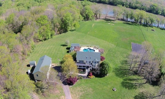 The Main House contains a Game Room, Projector Screen Movie Room, Dining Room, an Indoor Bar, a lower level Kitchenette, an outdoor Hot Tub, and a light-filled, open-concept Main Level. The expansive decks outfitted with grills, propane fire pits, and cozy chairs allow you to soak in the fresh air and river views. The Estate also contains a pool with an adjacent Tiki Hut for lazy afternoons along the Potomac River. You’ll find a shed full of outdoor games, an assortment of kayaks available for use during your stay, as well as a sports court for basketball, tetherball, and pickleball. Potomac Overlook Farms is truly a vacation destination designed to bring you closer to the ones you love.