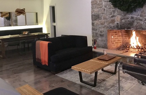 This modern home set on 3.5 acres of private woods just finished a 2 year renovation and features panoramic, breath taking mountain views, Scandinavian modern inspired interiors, a dramatic floor to ceiling stone fireplace, heated in-ground pool and hot tub. Rentals that are 7 days or longer are subject to utilities and propane (pool heat) charges. All rentals require a security deposit relative to the length of stay.