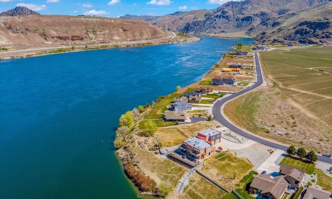 Expect spectacular views from every room of this luxurious riverfront home, boasting multiple waterfront decks, a private hot tub, and walkway with a petite private beach on the Columbia River. Spend your summer days fishing, golfing, boating on Lake Chelan, hiking, or mountain biking dozens of nearby trails, and winter mornings snowshoeing or cross-country skiing. The shops, restaurants, and attractions of Chelan are an easy seven-mile drive away.